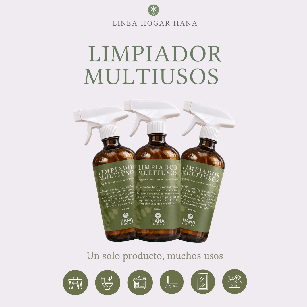 El Limpiatodo Ecológico Multiusos HANA Hogar está pensado para acompañar la limpieza diaria de forma práctica, 100% natural y consciente preparado a base de aceites esenciales puros en alta concentración, te aporta limpieza profunda para los distintos espacios del hogar, sin compuestos tóxicos y a la vez aportando un potente efecto repelente natural